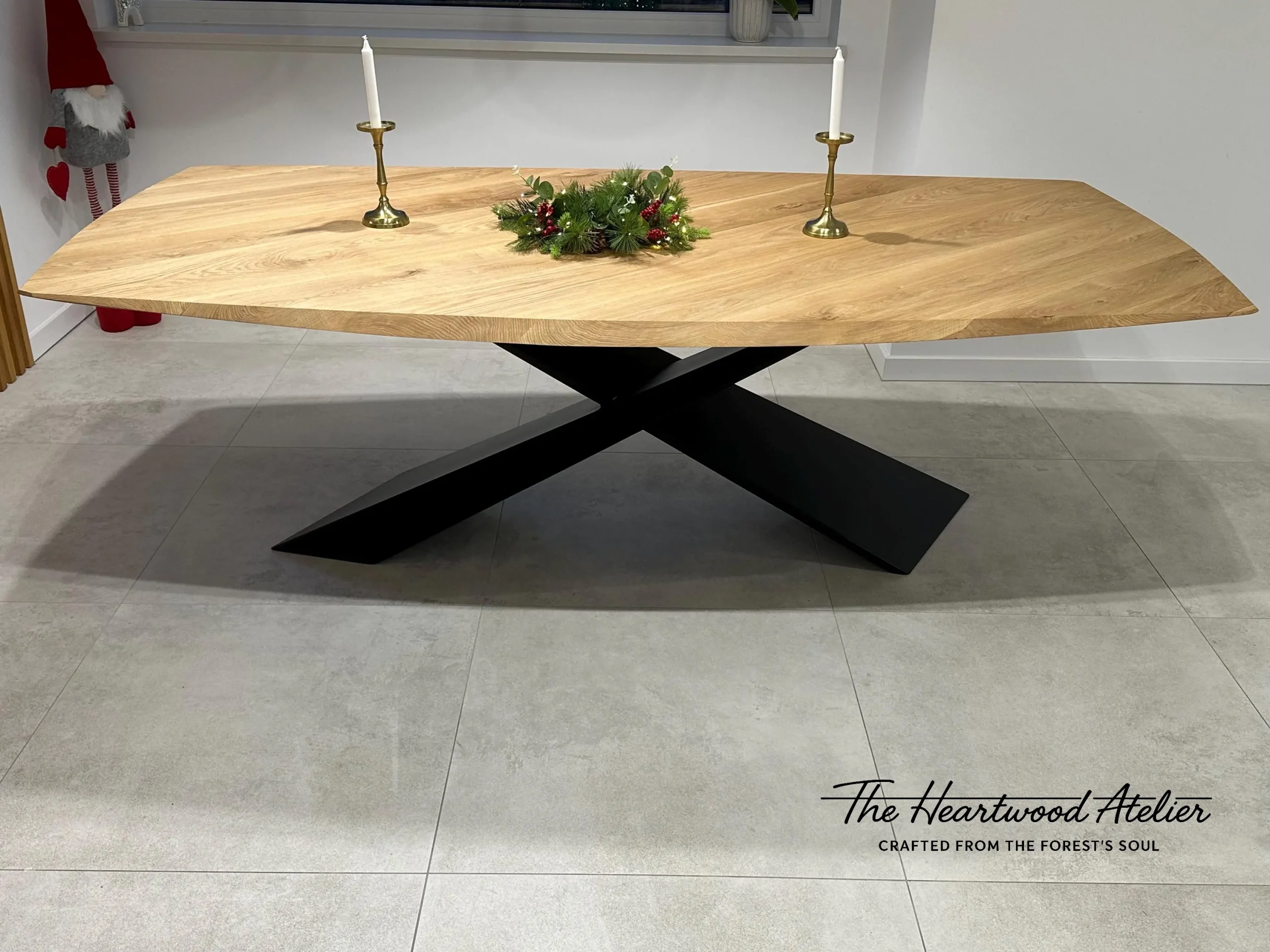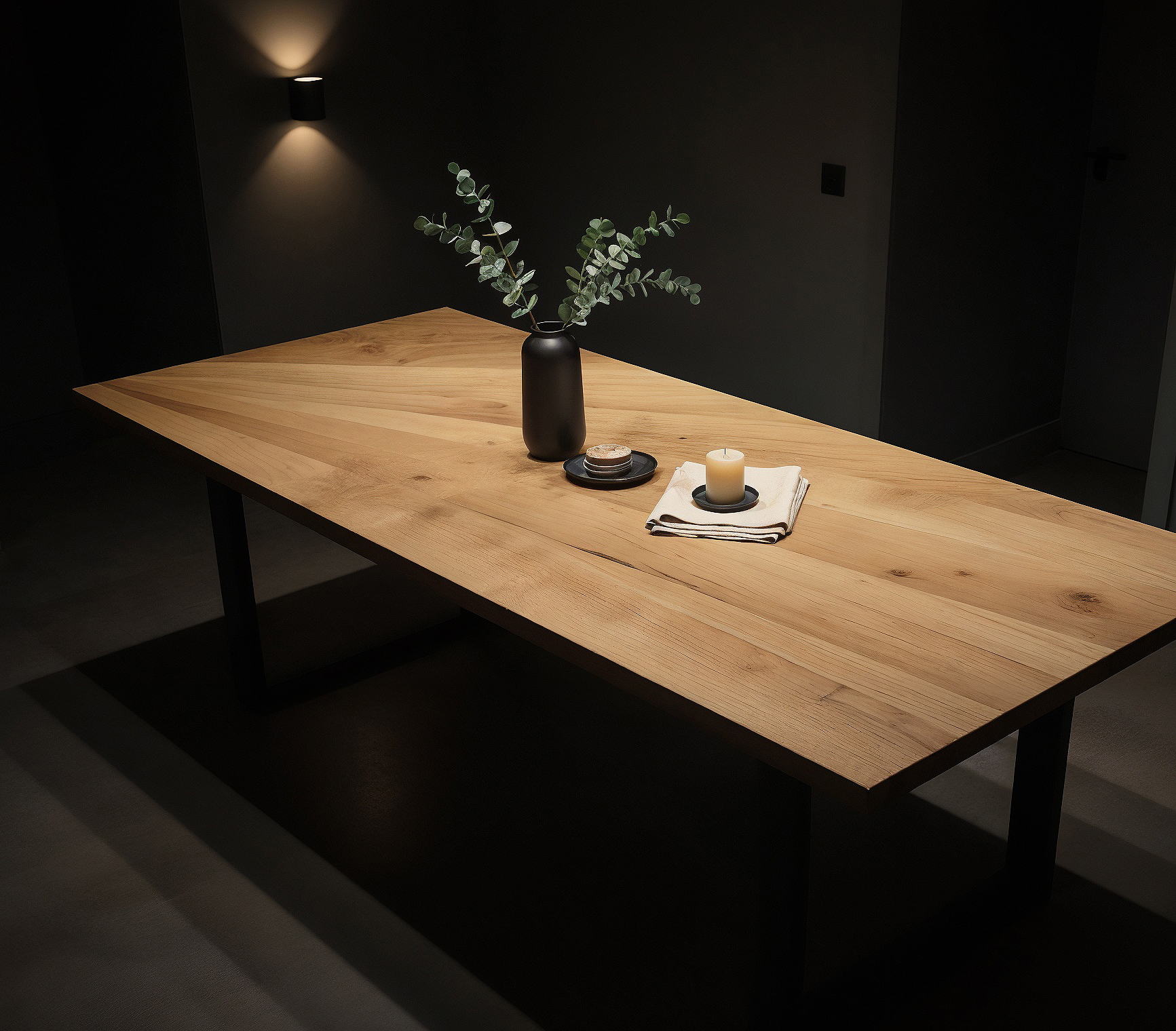 Dębowy stół z litego drewna 240×110 – ręcznie wykonany z ukośnym układem usłojenia | Nowoczesny minimalistyczny styl loftowy