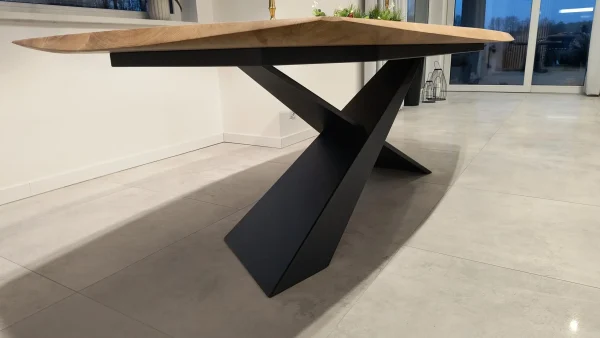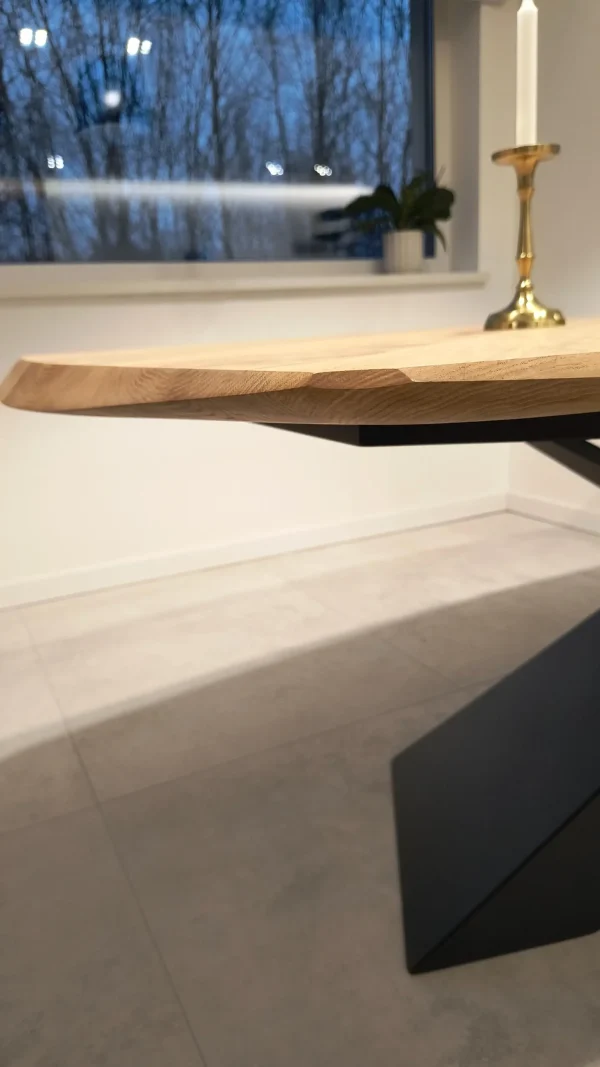 Każdy stół wykonany jest z wysokiej jakości litego drewna dębowego, które podkreśla naturalne usłojenie i niepowtarzalny charakter drewna. Nogi ze stali malowane proszkowo nadają industrialnego akcentu oraz gwarantują stabilność i trwałość na lata.